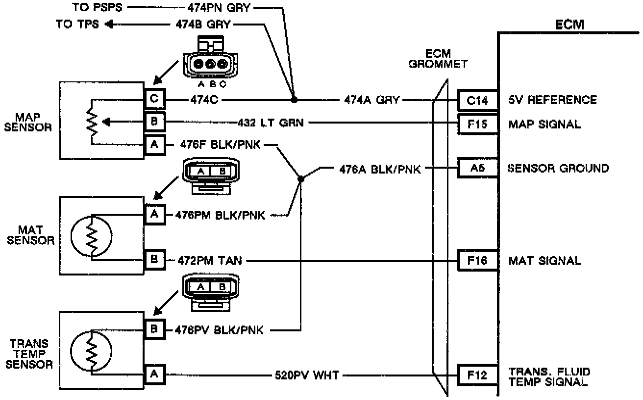 The manifold absolute pressure sensor (MAP) is a "3-wire" sensor, a potentiometer that change resistance based upon manifold vacuum, The ECM provides a 5 volt reference on CKT 474 and ground on CKT 476. The MAP signal (CKT 432) varies between ground and 5 volts as manifold vacuum varies. As MAP decreases, voltage decreases (low engine load, high vacuum). As MAP increases, voltage increases (high engine load, low vacuum).