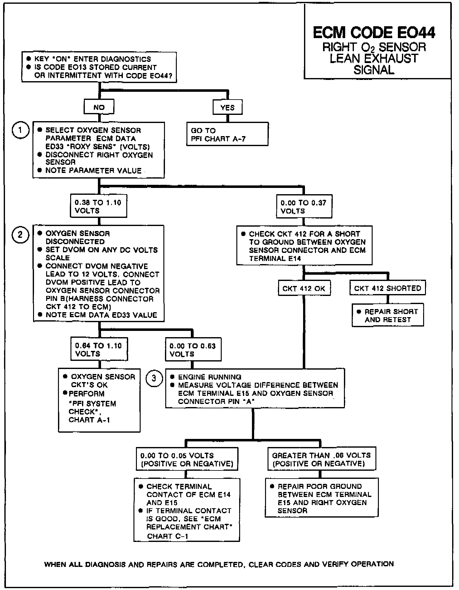 Code EO44 is designed so that if the oxygen sensor stays at a lean voltage for more than 50 seconds during the test conditions, Code EO44 will set.