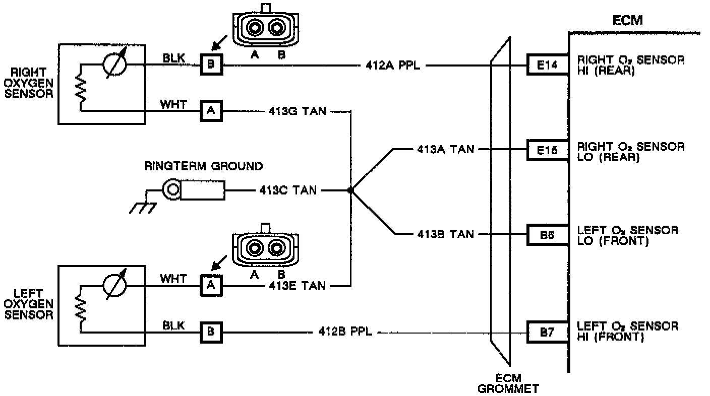 3. The ECM compares oxygen sensor signal voltage received on circuit 412 to the ground voltage on circuit 413. If the ground voltage on circuit 413 is not engine ground (battery negative), the oxygen sensor can appear falsely high or low. With the engine running, use a voltmeter to measure voltage from the oxygen sensor pin A to the ECM terminal E15. If the voltage is greater than -0.05 to +0.05 volts, repair poor ground on CKT 413 between ECM terminal E15 and engine ground.