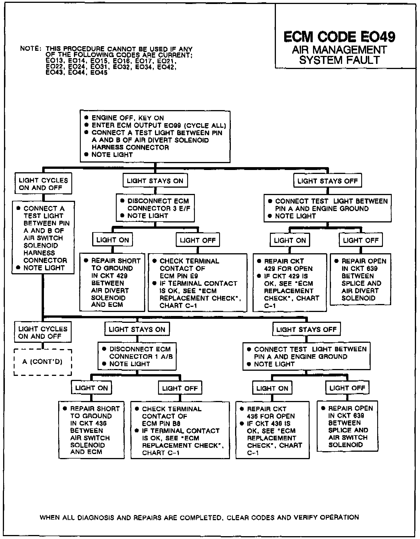 If Code EO49 is stored as an intermittent failure, verify proper operation of the oxygen sensors by using Chart A-7 in ECM Diagnostic Charts. Related Tests, Information and Procedures