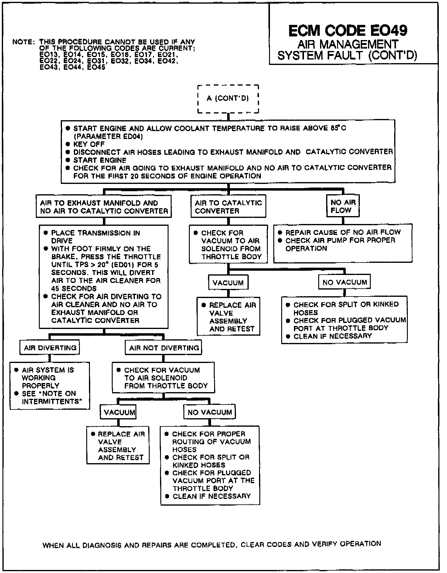 Code EO49 is designed to detect AIR system electrical and flow faults by watching the oxygen sensor react to AIR flow. After the fuel control system is in closed loop and AIR is directed to the catalytic converter, the ECM directs AIR to the exhaust parts and waits for the left fuel integrator to show lean operation as the excess oxygen is blown on the oxygen sensor. After a specified period of time, AIR is then diverted to the air cleaner and the ECM watches the left integrator for rich movement as the excess oxygen is taken away from the oxygen sensor.