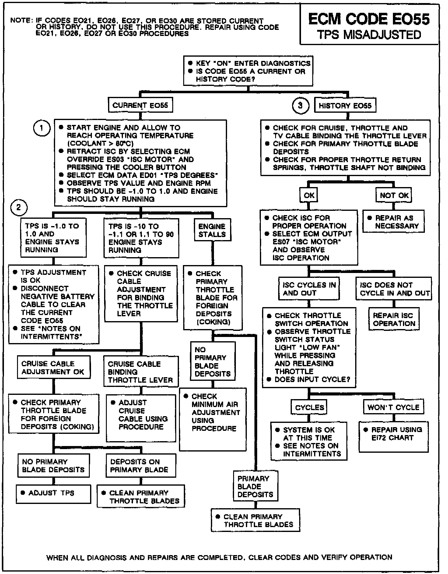 The TPS on 1987 PFI engine is "self adjusting". At key off the ECM executes a TPS learning routine only if the engine had been run long enough to warm up the underhood environment. After key off, the ECM will retract the ISC until the ISC throttle switch opens and the throttle linkage is resting on the minimum air screw. At that time, the ECM stores the TPS value and calculates a correction. If the same correction factor occurs on two consecutive key "off" cycles, the TPS is then corrected to 0 degrees using the correction factor "learned". If the value needs correction by more than -2.9 degrees or +3.0 degrees, Code EO55 will be stored in memory at the next key "ON" cycle. Because the ECM tests for Code EO55 alter the engine has been running for a certain period of time, a current Code EO55 cannot be cleared using the ECM clear codes mode. Disconnect the negative battery cable for 10 seconds to clear a current Code EO55. Note: Parameter ED01, TPS, displays uncorrected TPS values.