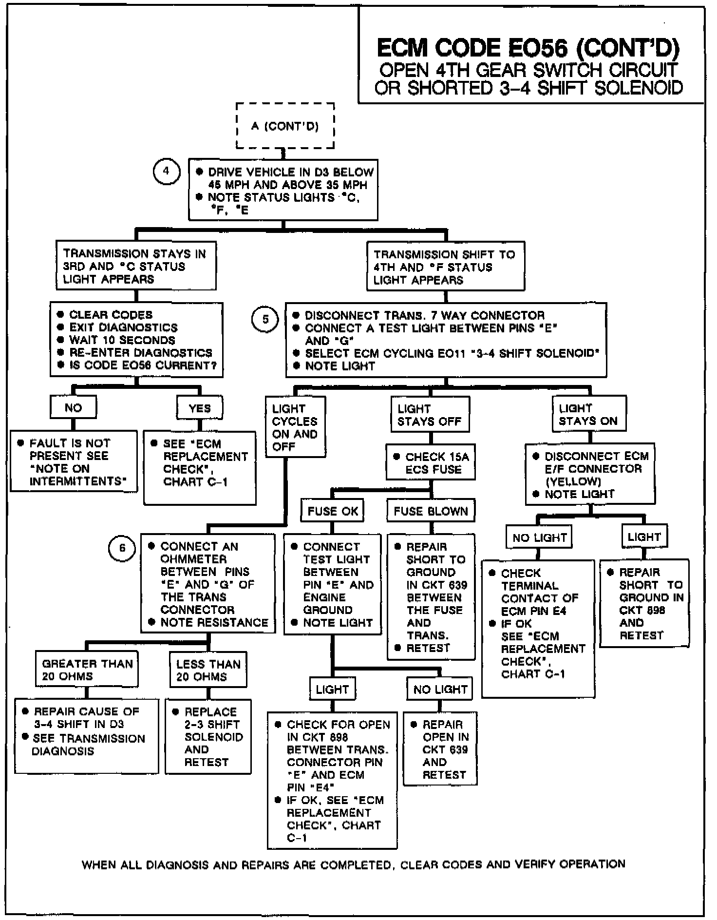 Code EO56 will set if the ECM is not commanding 4th gear but the fourth gear switch is open. Code EO56 will set if either the 4th gear switch circuit is open or if the 3-4 shift solenoid is shorted to ground causing it to shift to 4th gear all the time.