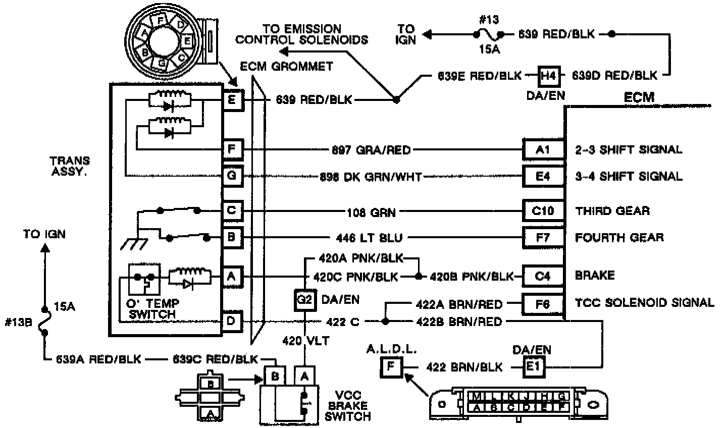 The fourth gear switch is a normally closed (grounded) switch located in the transmission that opens when 4th gear hydraulic oil is applied to it CKT 446 will be grounded when the 4th gear switch is closed and has 12 volts on it when the 4th gear switch is open.