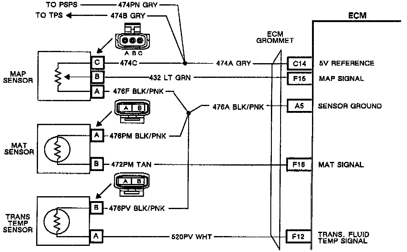 The transmission temperature sensor is a thermistor, or variable resistor, that varies in resistance based on temperature. The sensor is a "two-wire" sensor with a reference signal coming from the ECM to the sensor on Pin A (CKT 520) and a sensor reference ground on Pin B (CKT 476). As the temperature of the sensor increases, sensor resistance decreases. As the resistance decreases, the signal voltage from the ECM decreases due to the less voltage drop across the transmission temperature sensor. High temperature will result in low signal voltage on CKT 520 and low temperature will result in high signal voltage on CKT 520.