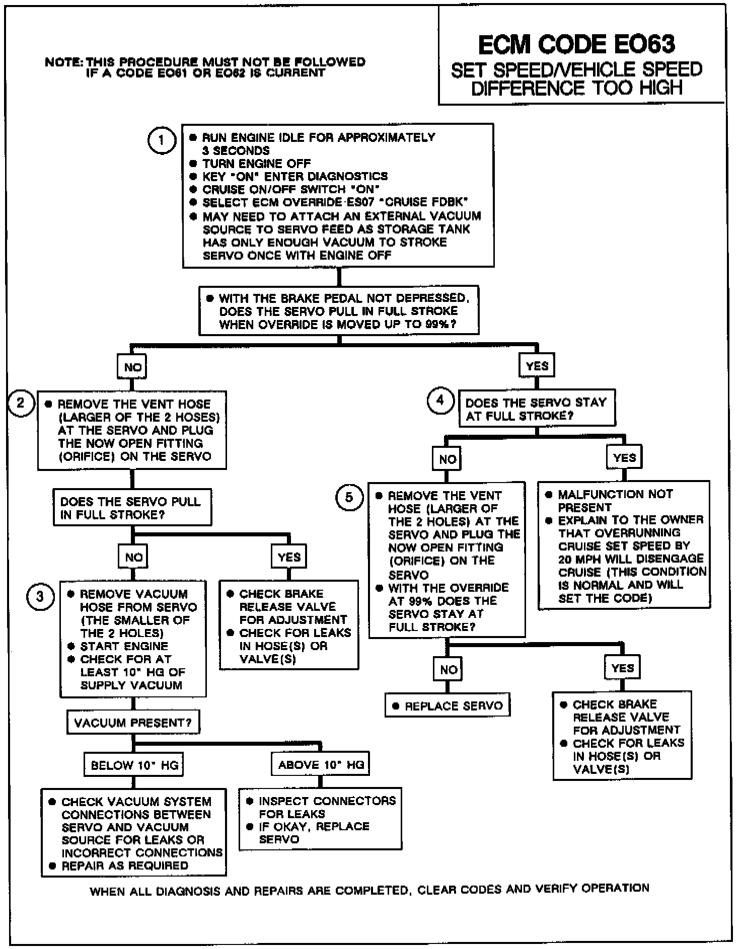 If Code EO63 is setting intermittently make sure owner is not overrunning set speed by more than 20 MPH. Check vacuum source and brake release vacuum lines for proper connections or slow leaks.