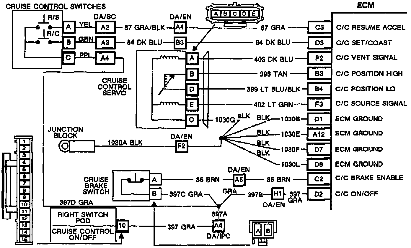 Code EO65 will detect an open or shorted to ground cruise control servo position sensor. The cruise position sensor is a variable inductance sensor whose inductance changes with servo position. ECM data ED70 displays cruise servo positive in percent of stroke (0-100%).