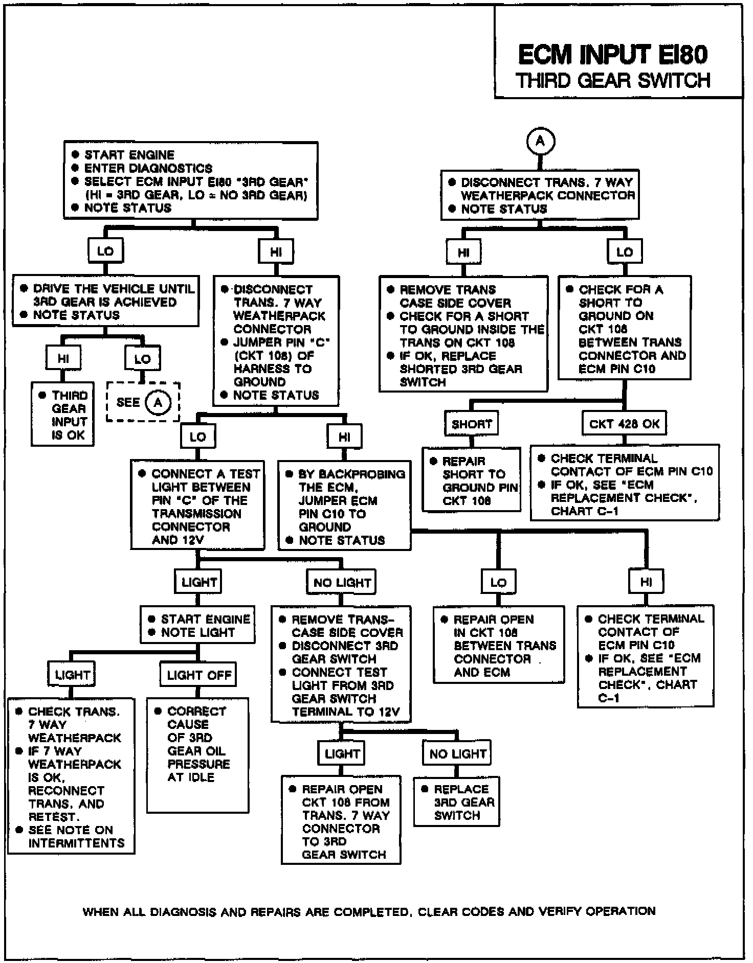 When the transmission reaches 3rd gear the °C status light should appear on the ECC head. If this status light is on when the transmission is not in 3rd gear, CKT 108 is open and must be repaired.