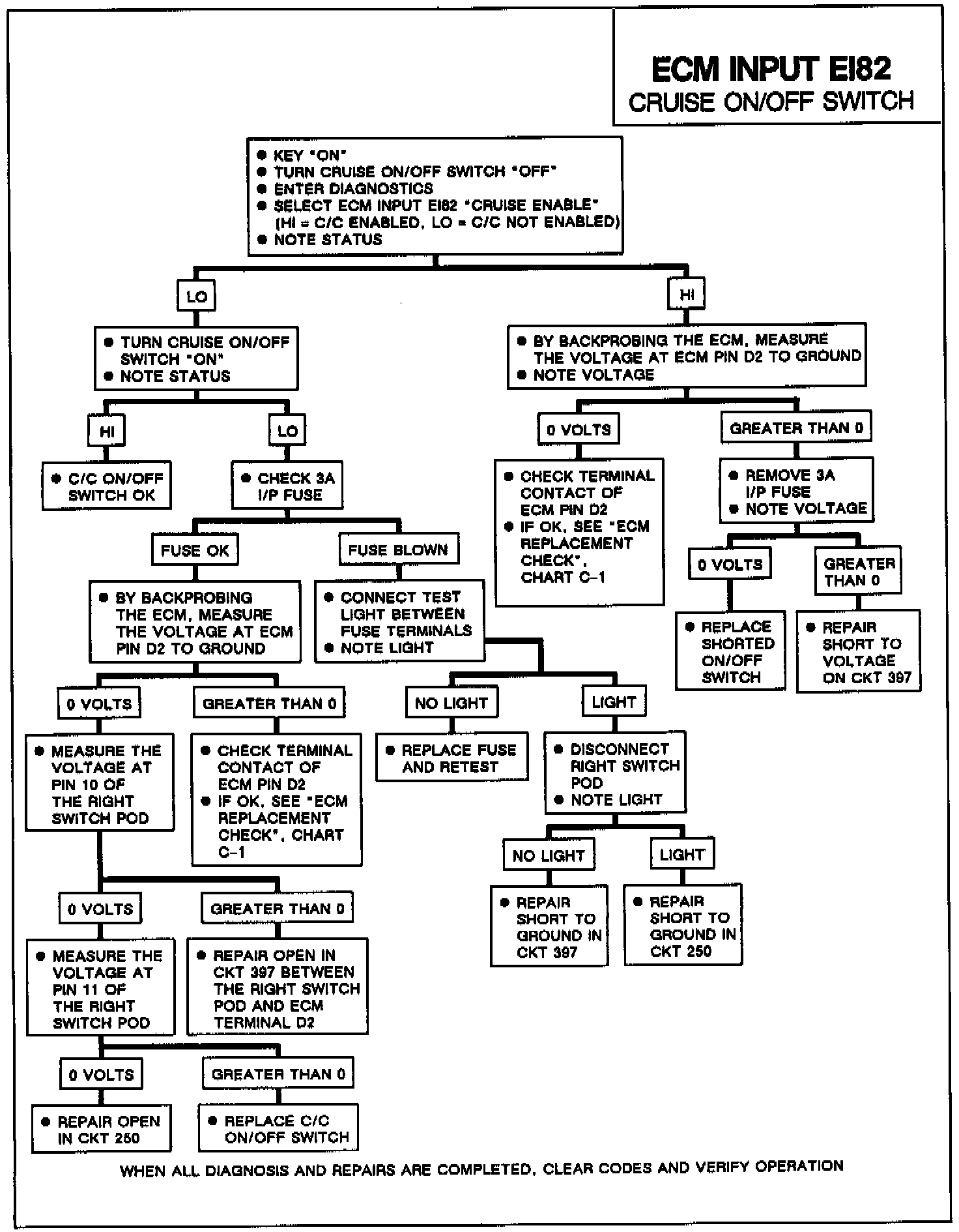 With the cruise switch on, observe ECM input EI82. Manipulate affected wiring. If the fault is indicated, the status will jump from "LO" to "HI". Repair intermittent open in CKT 397.