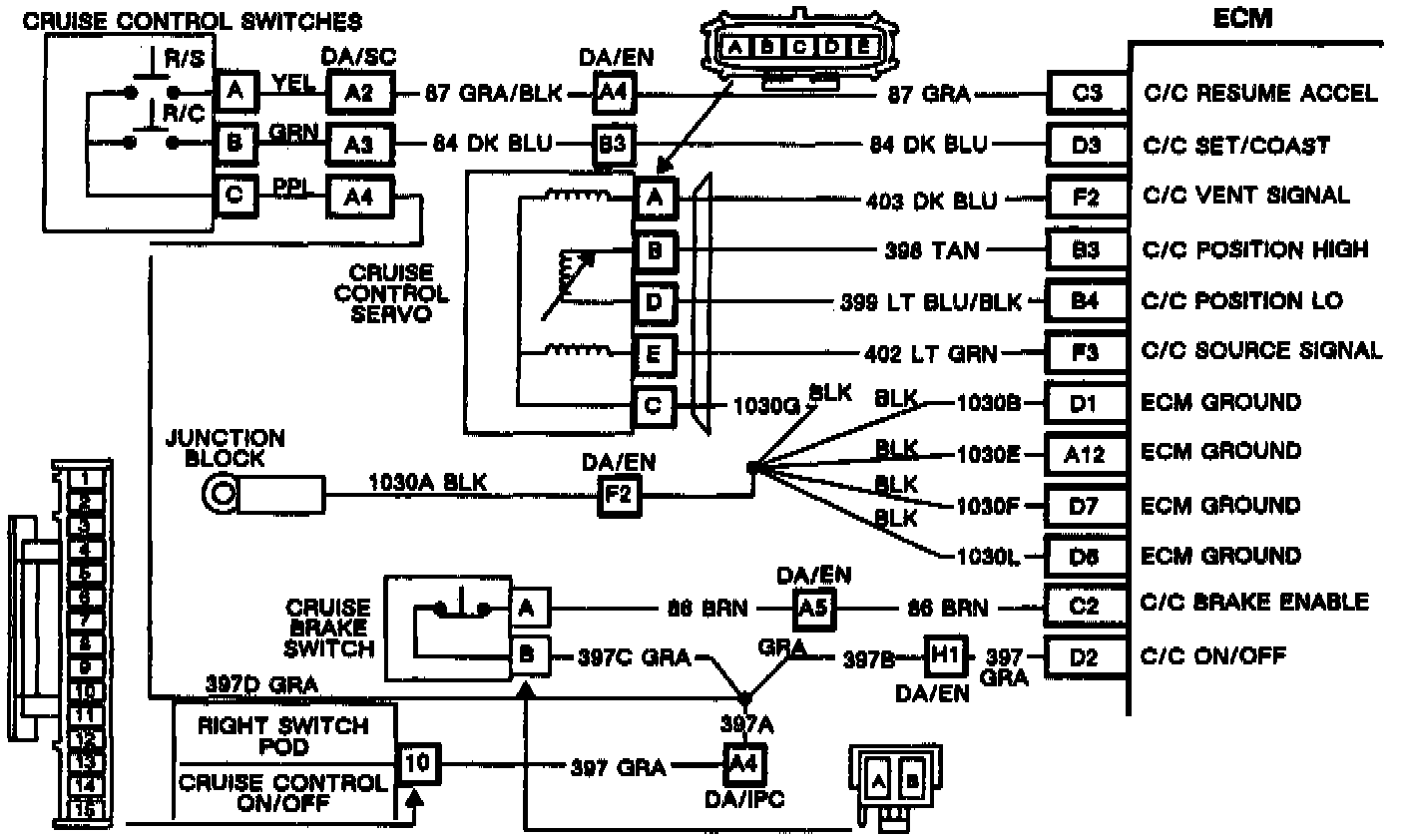 The cruise control ON/OFF Switch, located on the right switch pod, provides information to the ECM about cruise on/off status. With the cruise switch on, 12 volts is provided to the ECM on CKT 397. With the switch in the off position, CKT 397 is open.