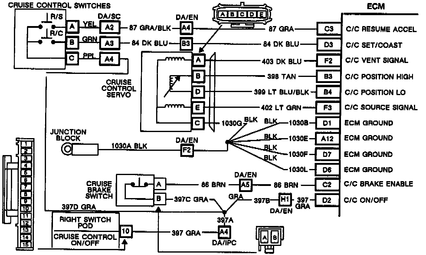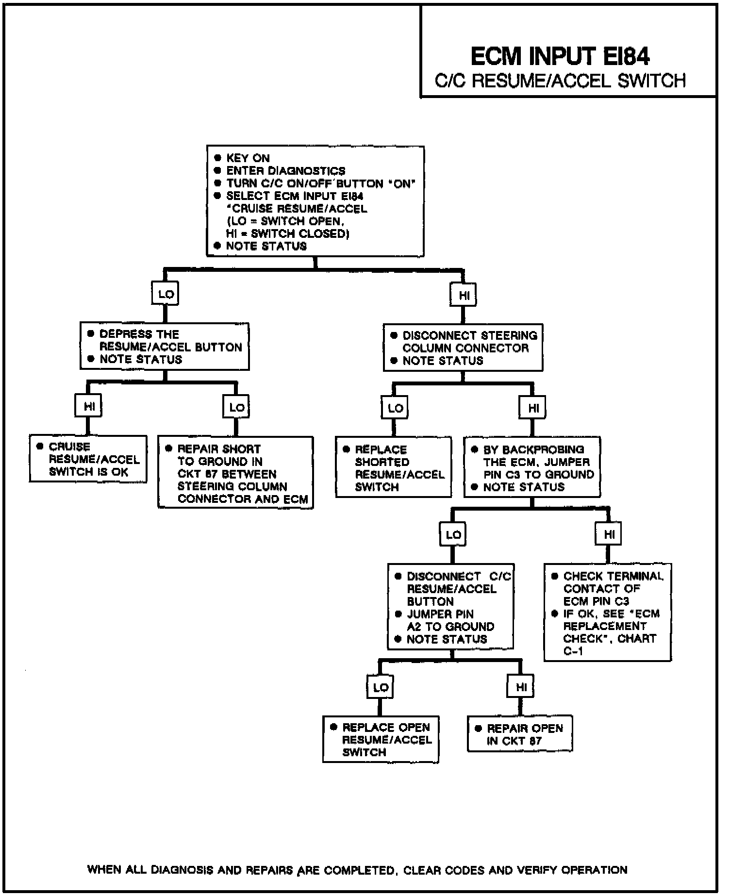 DESCRIPTION The resume/accel switch is a normally open switch that supplies 12 volts to the ECM when pushed. ECM input EI84 is "LO" with the button not pushed and "HI" with the button depressed.