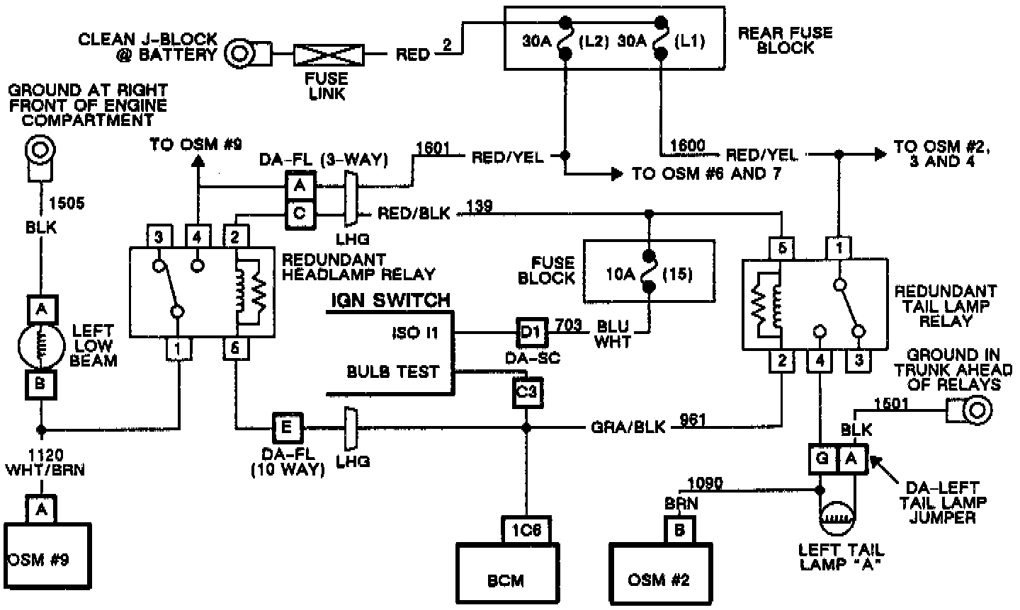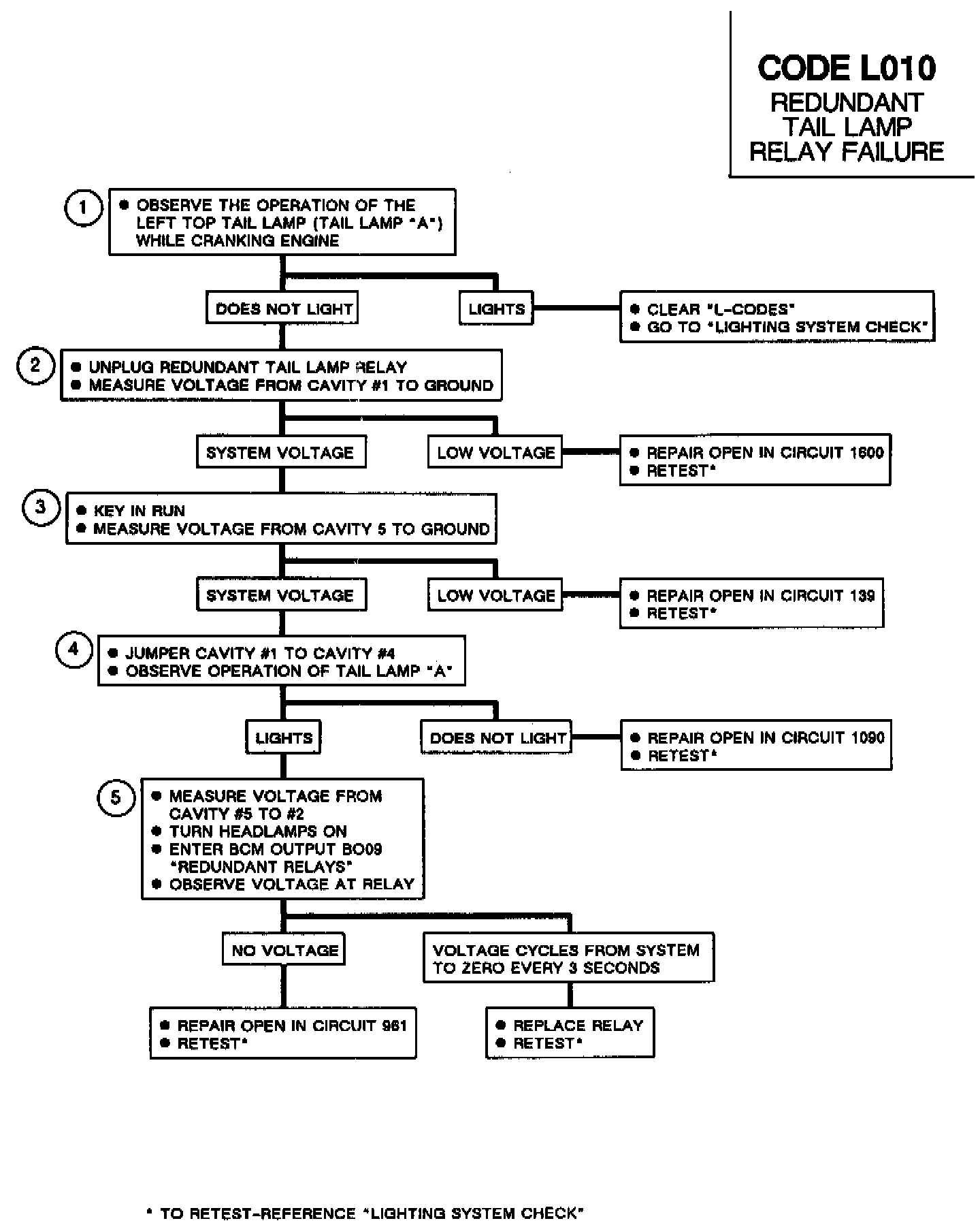 The Body Control Module (BCM) checks the operation of the redundant relays each ignition cycle after the headlamps are first activated. If the BCM suspects that the tail lamp relay is inoperative, the code L010 will be set.