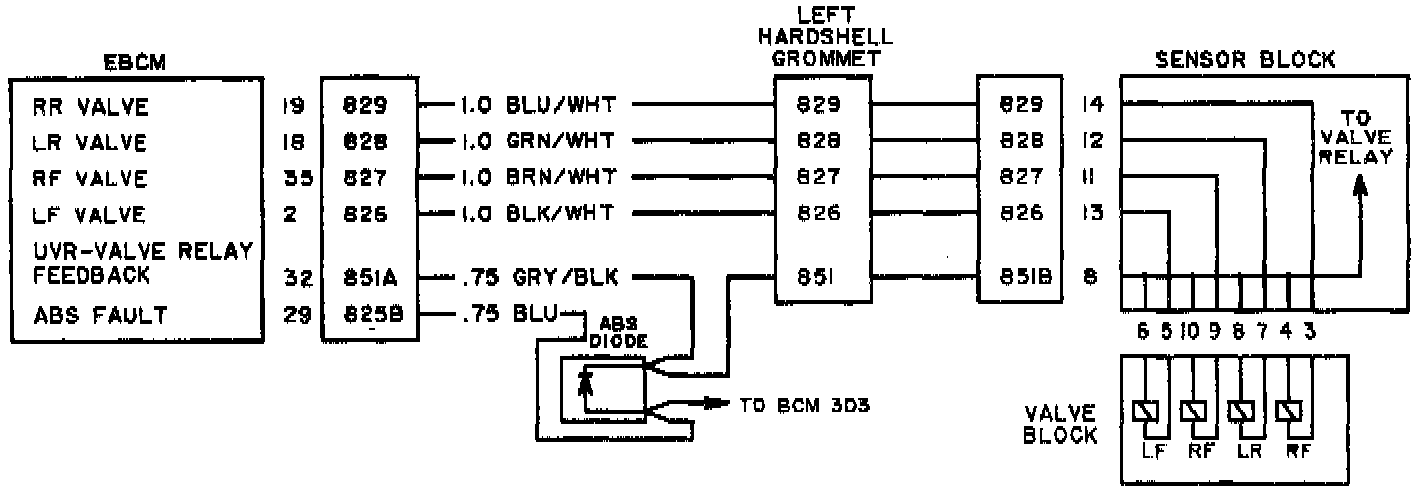 The valve block contains four valves for control of hydraulic pressure in the wheel circuits. These valves may be commanded into three different positions by the EBCM. Valve position is determined by the amount of current which is allowed to flow through the valve coil.
