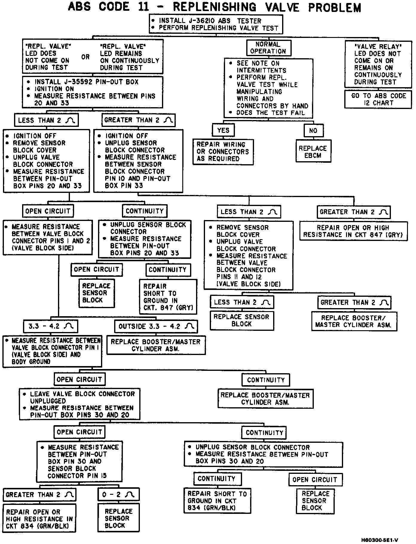 ABS Code 11 will set anytime that the commanded replenishing valve position and the valve position indicated by the feedback line do not agree. With the valve not engaged, the feedback line (pin 33) should be at ground. With the valve engaged, the feedback line should be at 5 V.