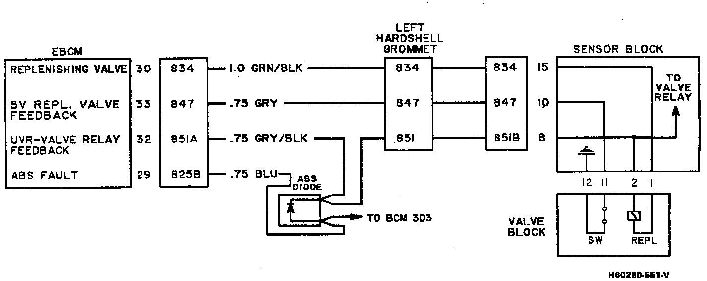 The replenishing valve circuit receives power through the valve relay. The valve relay, which is included as part of the sensor block assembly, is engaged at key-on and remains engaged throughout the ignition cycle. The replenishing valve line (at the EBCM) should have battery voltage present at all times.