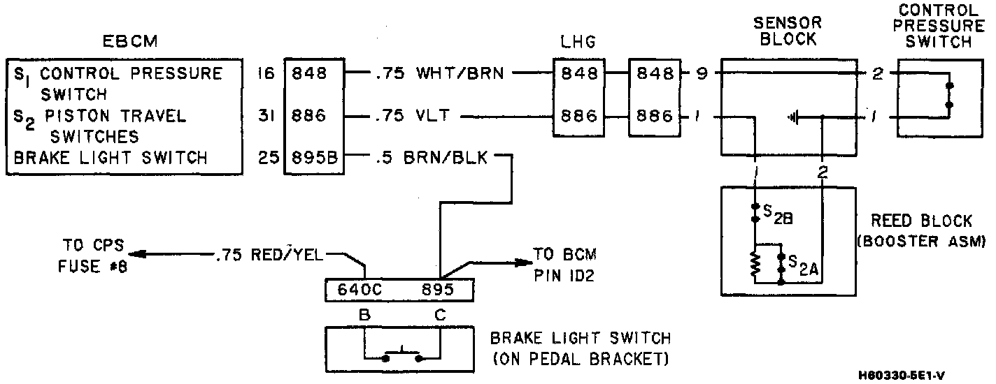 Two piston travel switches are located in the booster reed block assembly. They are monitored on circuit 886 (EBCM pin 31), which is provided 5 volts by the EBCM. When the brakes are not applied, this line is held to ground by the piston travel switches as shown in the above schematic.