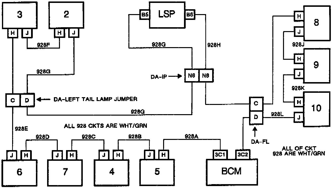 3. If the right rear tail-lamps operate with the DA-FL and the DA-left tail lamp jumper removed then the short is in the left tail jumper, or in circuit 928G or 928H.