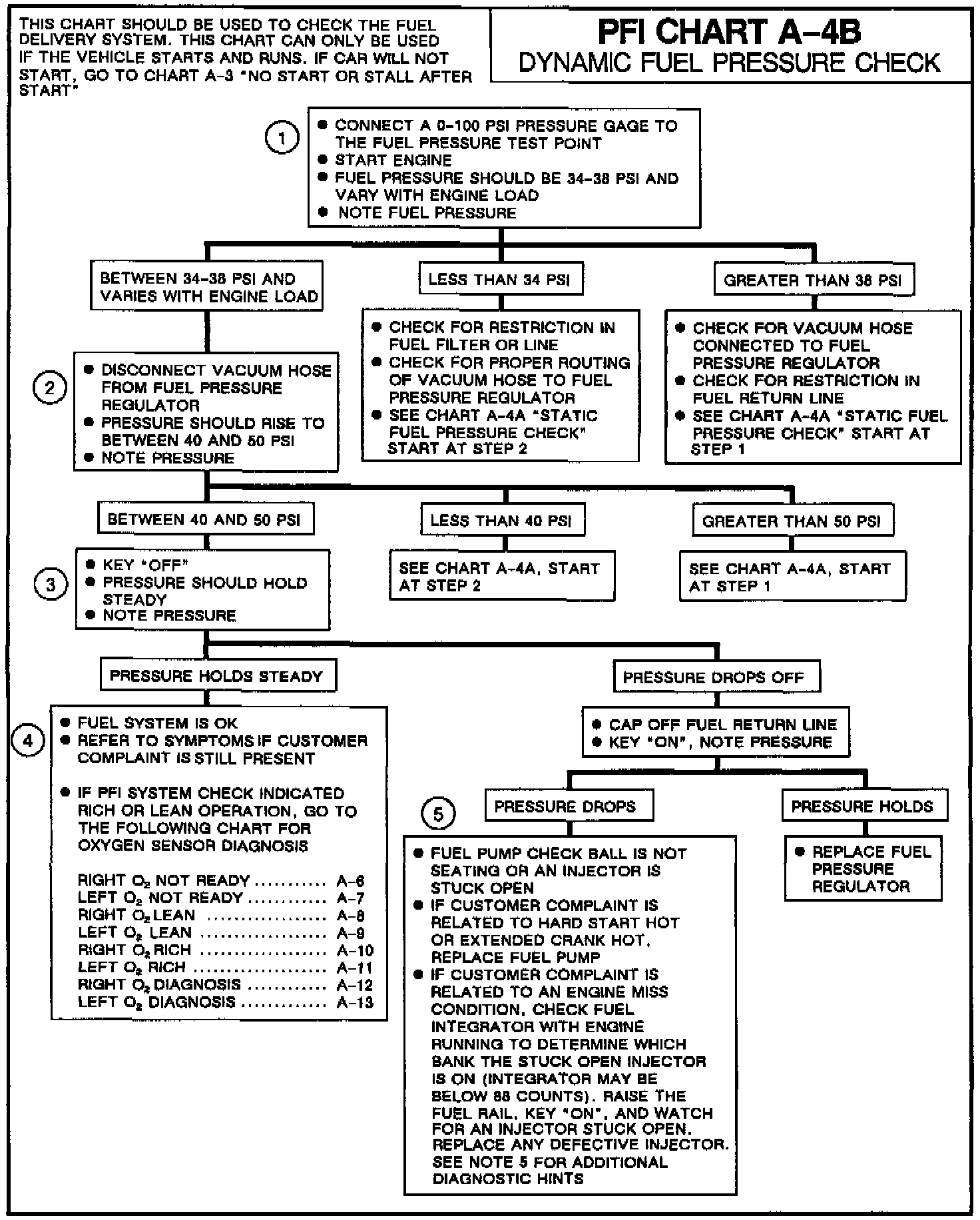 2. By disconnecting the vacuum hose, engine load compensation is taken away from the fuel pressure regulator. Pressure should rise to approximately 45 psi. if fuel pressure is higher than 50 psi or lower than 40 psi, go to Chart A-4A to diagnosis fuel delivery problems. A-4A Static Fuel Pressure Diagnosis