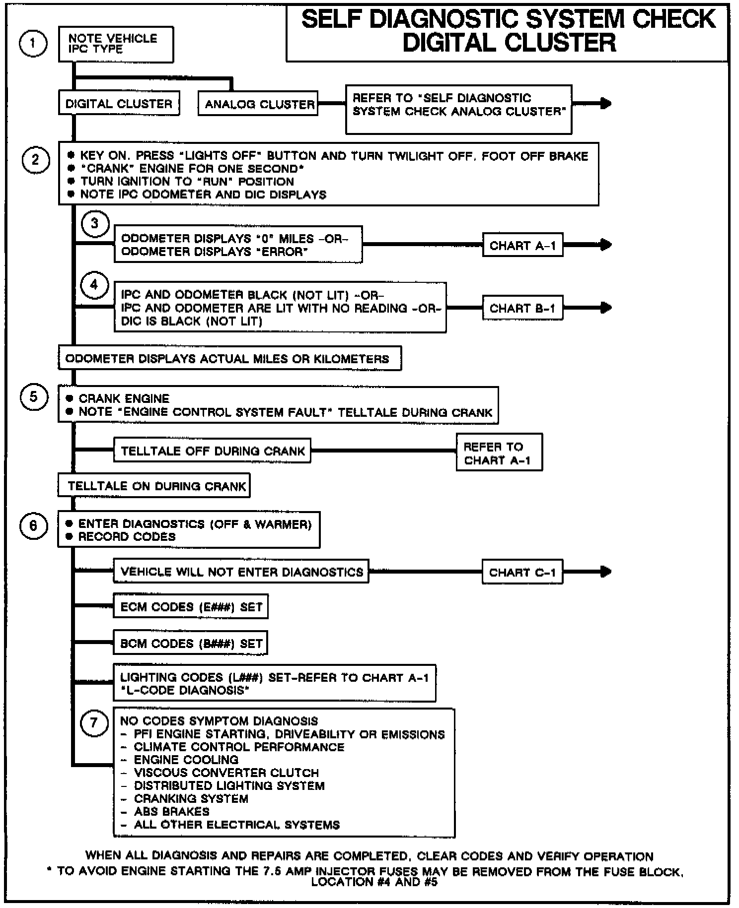 6. The odometer displays and "Engine Control System Fault" lamp works - Enter diagnostics and continue with code diagnosis chart. If diagnostics cannot be entered refer to Chart C-1. Chart C-1 Vehicle Will Not Enter Diagnostics
