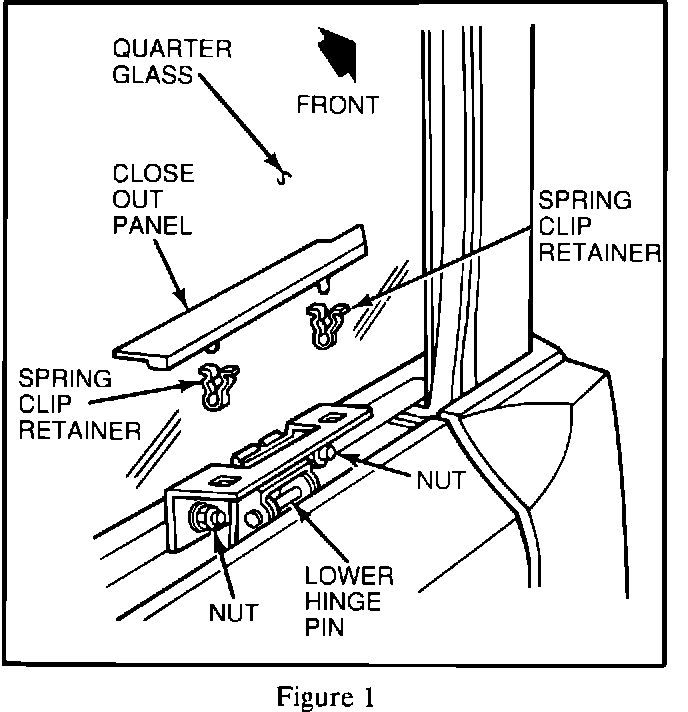 1. Remove the left quarter glass hinge close out panel by pulling upward on the panel. Remove the spring clip retainers from the hinge assembly. Refer to Figure 1.