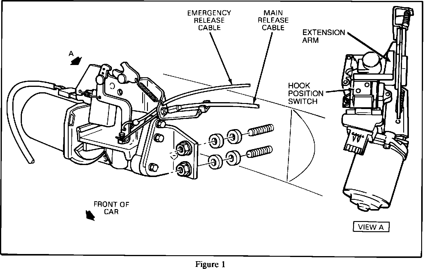 A distorted or damaged extension arm indicates excessive force has been used in latching the rear bow. To prevent recurrence, ensure that the soft top hook and pulldown unit jaws are properly aligned and operating correctly. Check the main and emergency release cables (refer to Figure 1) for binding/misadjustment which may hold the jaws slightly open and not able to fully grasp the hood. Also, make sure the hook does not contact the pulldown unit when raising or lowering the soft top. Also make sure the customer understands the correct procedure for raising the top before returning the vehicle.