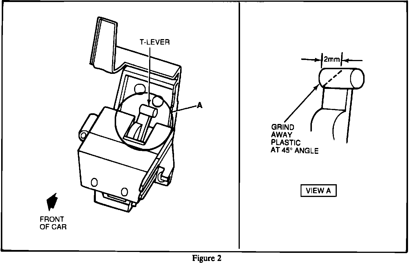 6. Remove the pulldown from the rear of the stowage well but do not detach the cables. Disconnect the electrical connection and remove the hook position switch assembly from the pulldown unit. Modify the "T" lever on the switch as shown in Figure 2. Proceed to next step.