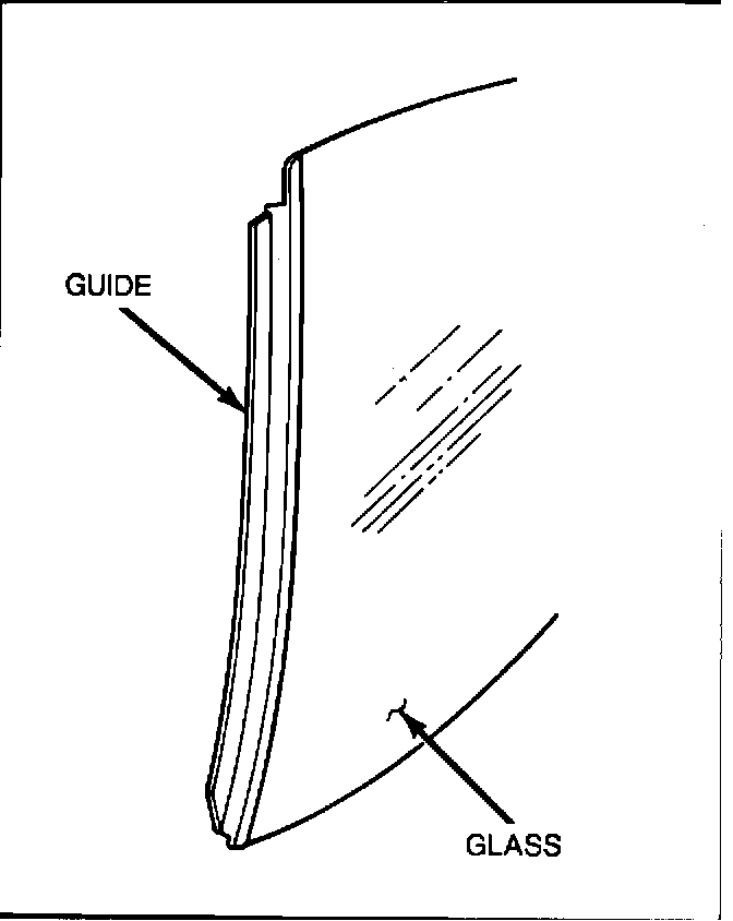 6. Remove the door glass and inspect the aluminum guide that is bonded to the front of the glass. Sight down the length of the glass from top to bottom and verify that the contour of the guide matches the contour of the glass. If the guide is "twisted" (refer to Figure 2), cover the guide with masking tape to protect the guide appearance; and reform the guide with hammer and dolly or pliers to match the contour of the glass (refer to Figure 3).