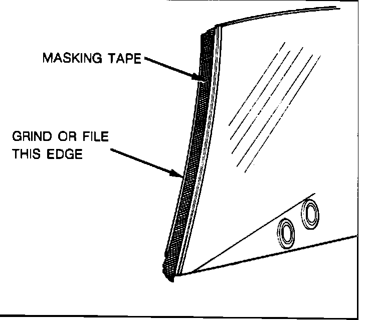 7. Inspect the leading edge of the guide for wear. The guide is designed for inboard and outboard support of the glass only and should not contact the leading edge of the run channel felt strip. To eliminate the possibility of the guide "bottoming out" in the run channel, file or grind 4mm off the entire front edge of the guide. Use a strip of masking tape as a guide, refer to Figure 4. Smooth all sharp edges and round off comers to prevent the guide from "digging in" to the run channel felt strip.