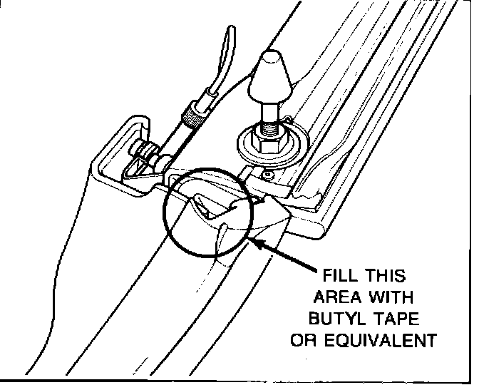 3. Fill the area shown in Figure 5 with windshield butyl tape or equivalent until the tape is flush with the base of the B-Pillar and press foam patch onto the top as shown in Figure 6.