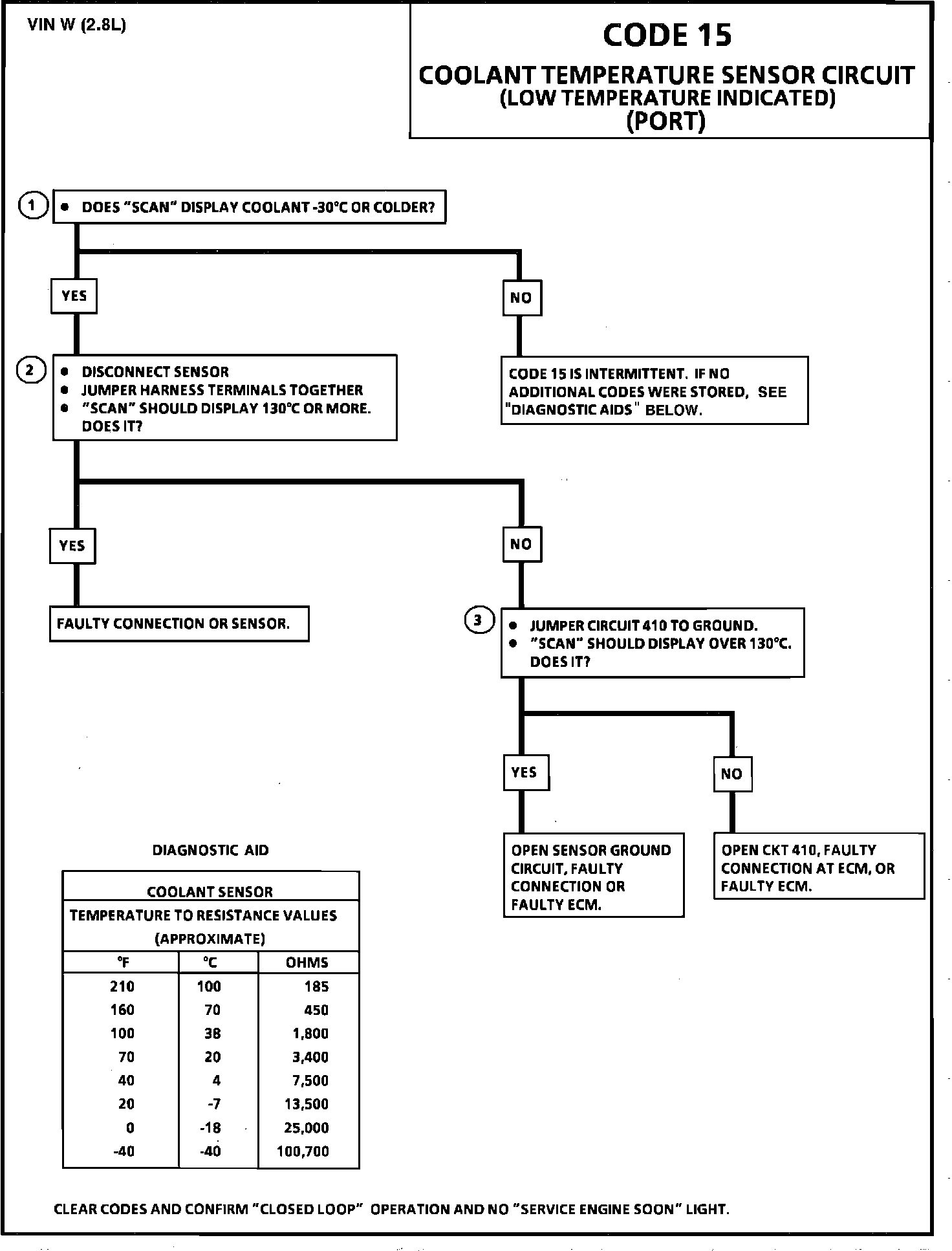 1. Code 15 will set if signal voltage indicates a coolant temperature less than -44°C (-47°F) for 3 seconds.