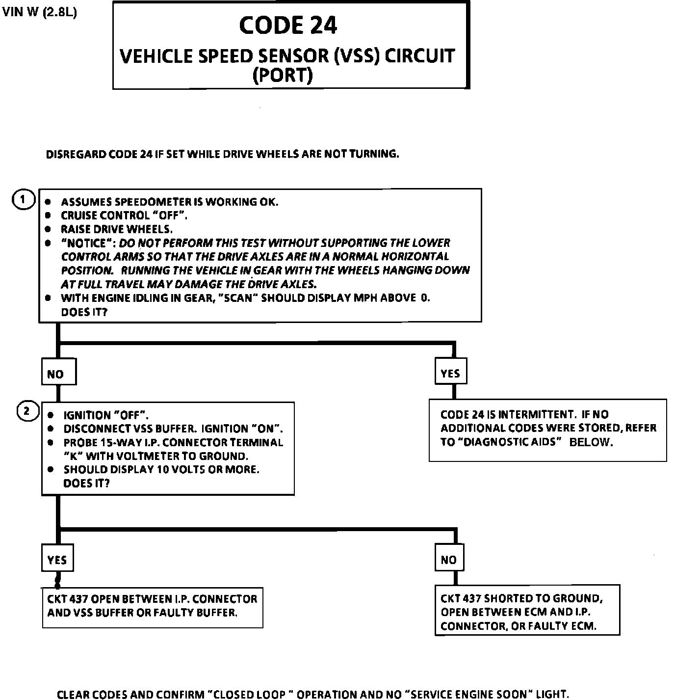 The Electronic Control Module (ECM) applies and monitors 12 volts on CKT 437. CKT 437 connects to the Vehicle Speed Sensor (VSS) which alternately grounds CKT 437 when drive wheels are turning. This pulsing action takes place about 2000 times per mile and the ECM will calculate vehicle speed based on the time between "pulses.""Scan" reading should closely match with speedometer reading with drive wheels turning.Disregard a Code 24 set when drive wheels are not turning.