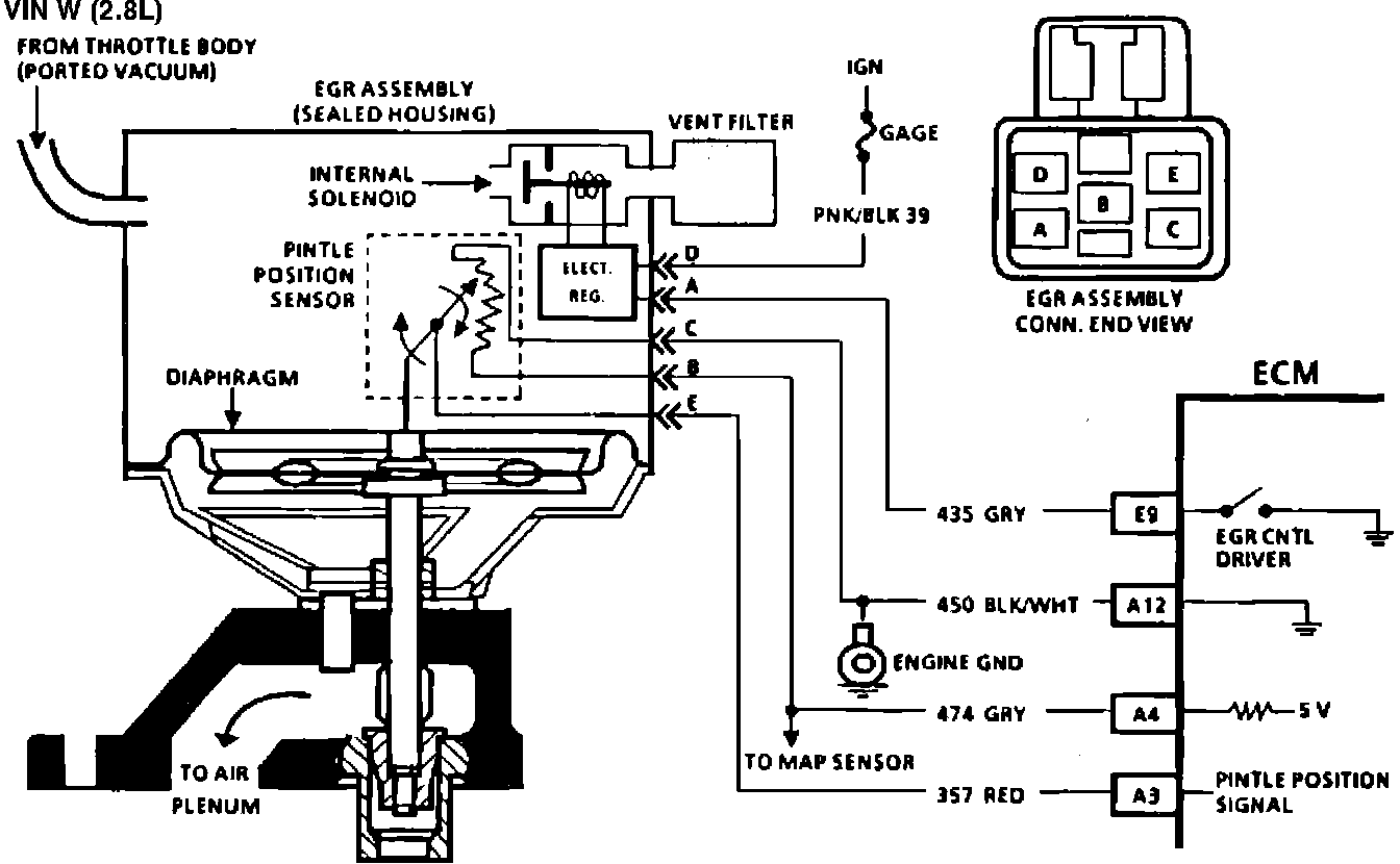The integrated electronic Exhaust Gas Recirculation (EGR) valve funtions similar to a port EGR valve with a remote vacuum regulator. The internal solenoid in normally open, which cases the vacuum signal to be vented "OFF" to the atmosphere when EGR is not being commanded by the Electronic Control Module (ECM). This, EGR valve has a sealed cap and the solenoid valve opens and closes the vacuum signal which controls the amount of vacuum venter to atmosphere, and this controls the amount of vacuum applied to the diaphragm. The electronic EGR valve contains a voltage regulator which converts the ECM signal to provide diggerent amounts of EGR flow by regulating the current to the solenoid. The ECM controls EGR with a pulse width modulated signal (turns "ON" and "OFF" many times a second based on air flow, Throttle Position Sensor (TPS), and rpm.