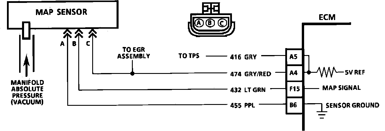 The manifold absolute pressure sensor (MAP) responds to changes in vacuum (manifold pressure). The ECM receives this information as a voltage that varies from about 1-1.5 volts at idle (high vacuum) to 4-4.5 volts at wide open throttle (low vacuum).
