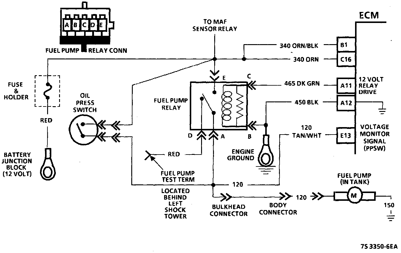 The status of the fuel pump CKT 120 is monitored by the Electronic Control Module (ECM) at terminal "E13" and is used to compensate fuel delivery based on system voltage. This signal is also used to store a trouble code, if the fuel pump relay is defective or fuel pump voltage is lost, while the engine is running. There should be about 12 volts on CKT 120 for 2 seconds, after the ignition is turned, or any time references pulses are being received by the ECM.