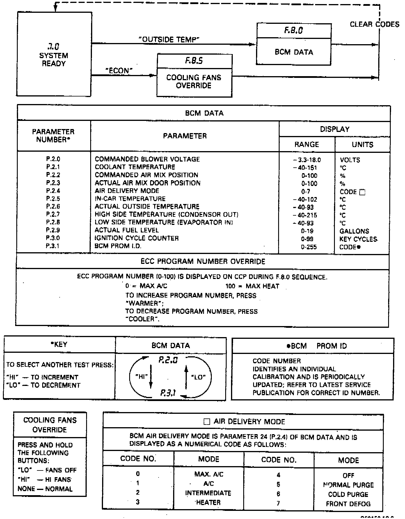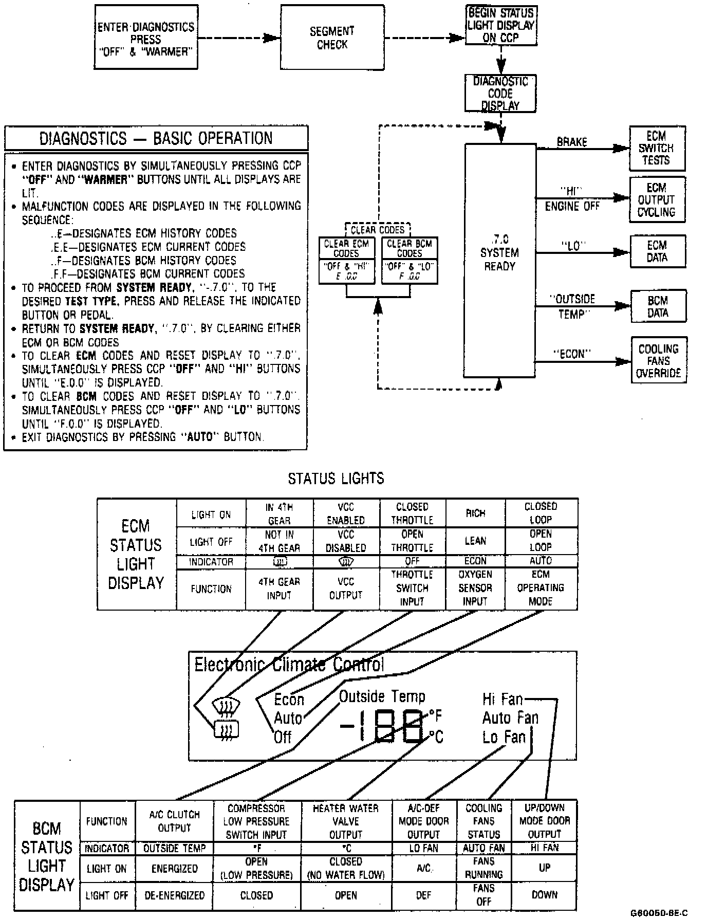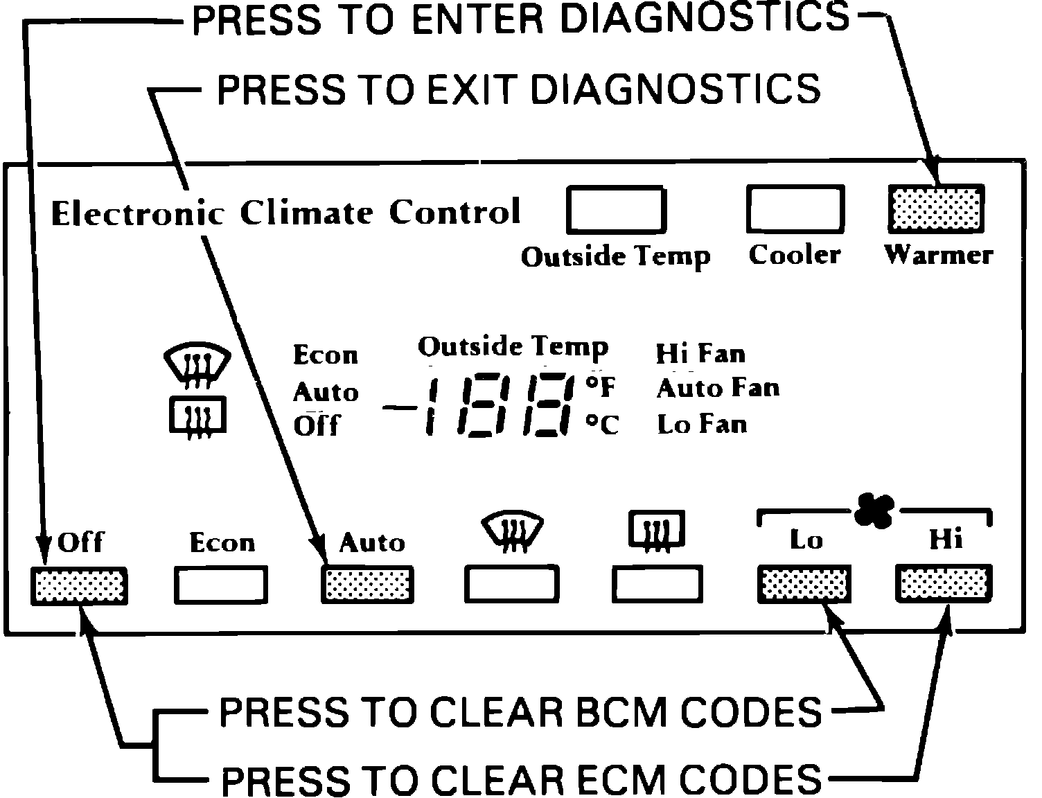 To enter diagnostic mode, turn ignition On, then depress Off and Warmer buttons on the Climate Control Panel (CCP), Fig. 4. Hold buttons until all display panel segments illuminate, indicating beginning of diagnostic readout. The two display panels must be illuminated to ensure all segments are operating. Do not attempt diagnosis unless all segments appear, as a misdiagnosis could result. If any segments are inoperative, the display panel must be replaced.