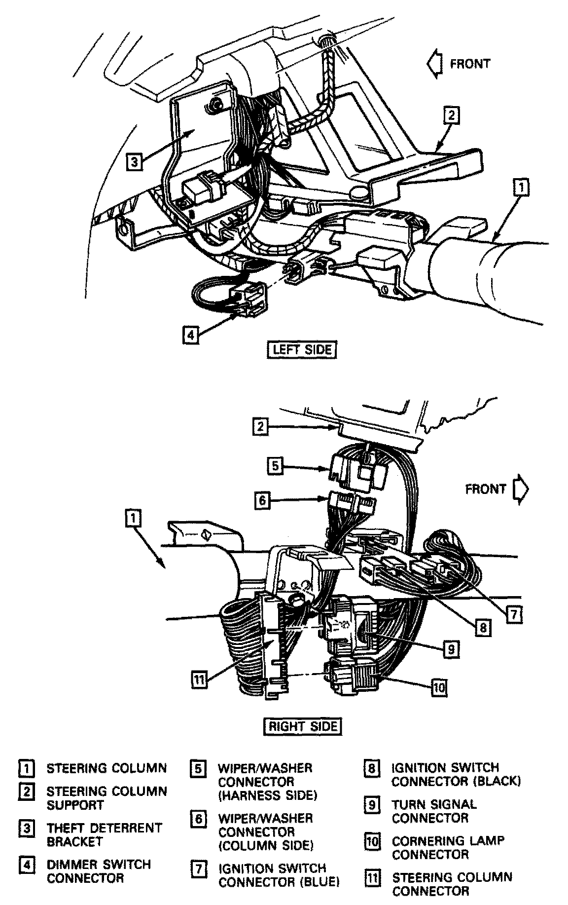 5. Ignition, headlight dimmer, cruise control, turn signal and washer/wiper connectors form the steering column. See figure 3B2-7. The black ignition switch connector must be removed before the blue ignition switch connector.