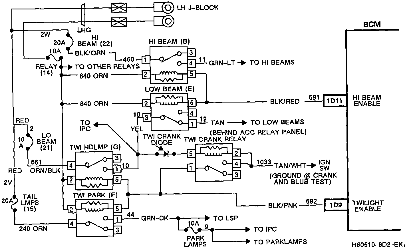 1. Checks to see if the fault is due to an open circuit or a short to ground in the circuit. If the HI beams are always on, then there is a short to ground in control circuit and if the HI beams never turn on, then there is an open in one of the circuits.