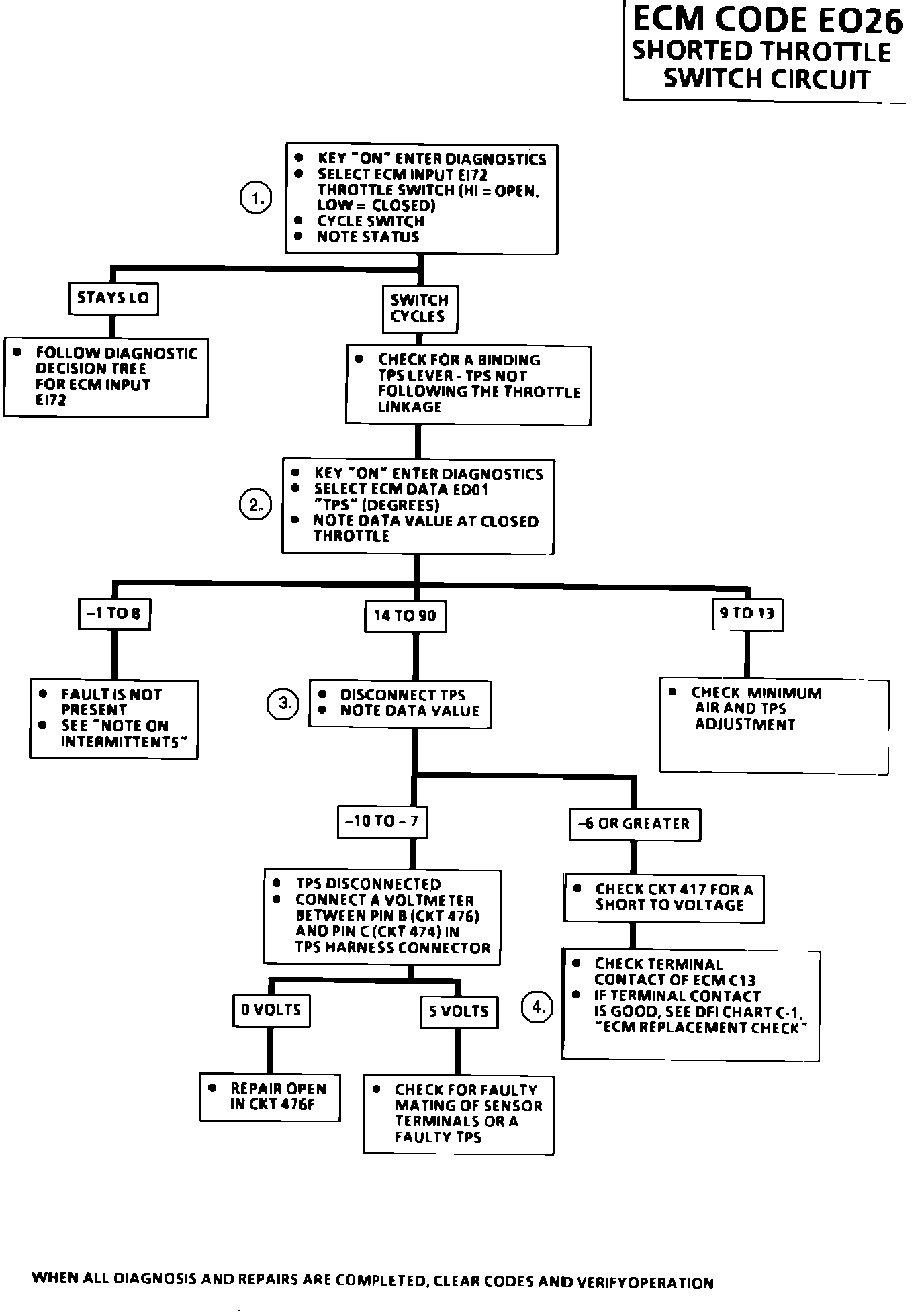 Select ECM data ED01. Manipulate affected wiring and connectors and watch for TPS value to go above 14° at closed throttle. Tap lightly on the TPS with a pencil or pocket screwdriver. (Check for binding TPS lever, intermittent open on CKT 476 or intermittent short to 5 volts on CKT 417 at TPS.