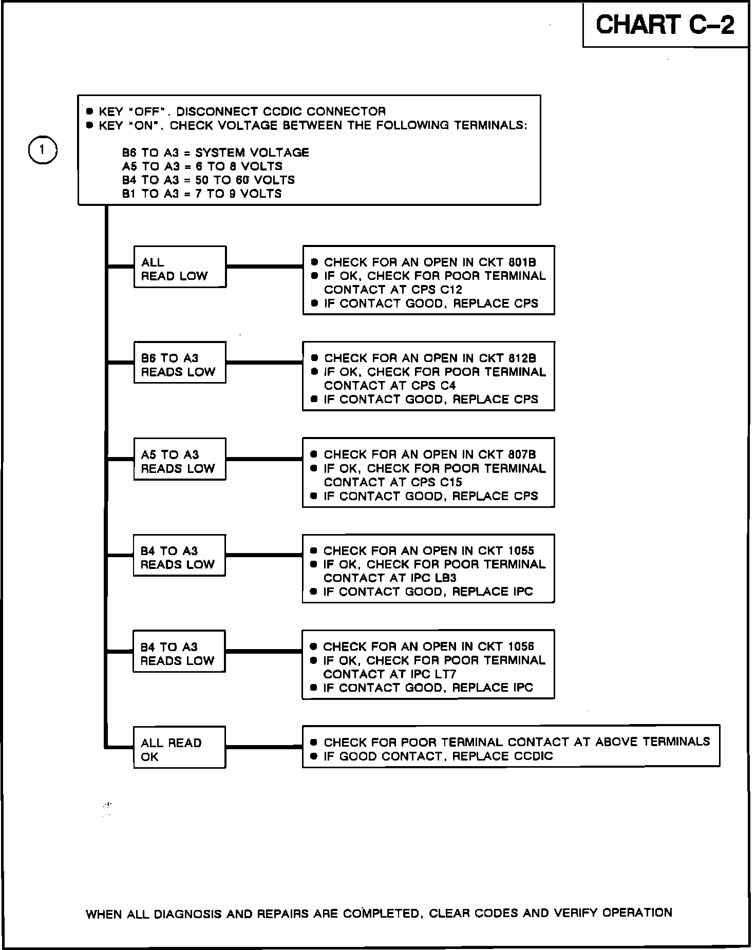 1. Disconnecting the CCDIC connector and performing individual circuit checks will determine if the wiring connector (or terminal) or the component is faulty.