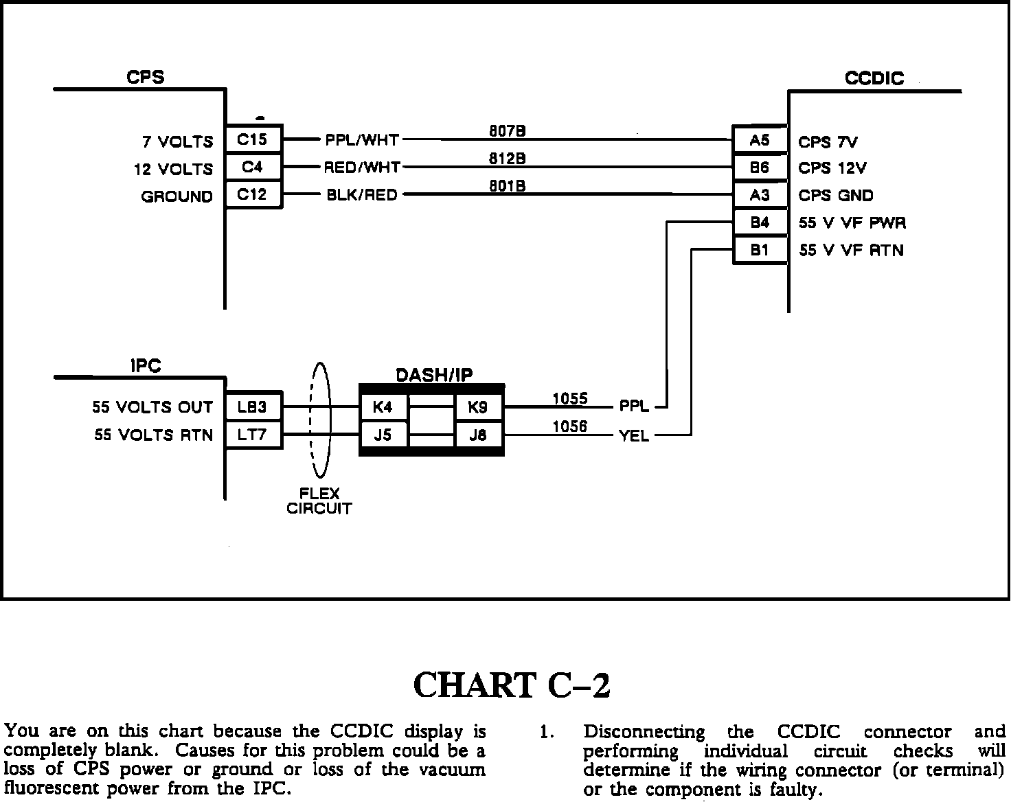 You are on this chart because the CCDIC display is completely black. Causes for this problem could be a loss of CPS power or ground or loss of the vacuum fluorescent power from the IPC.