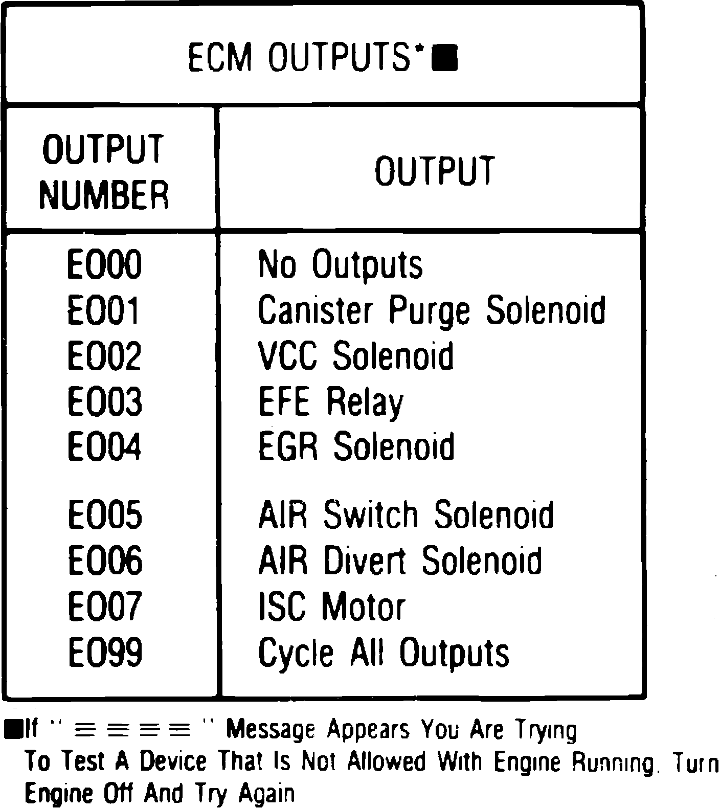 With the ECM message displayed on the panel as outlined above, depress the Hi, then the Lo button twice. This will allow the technician to bypass ECM data and inputs and proceed directly to ECM outputs. Selection of the ``Output'' test type will result in the first available test being displayed. When a test has been selected, ``HI'' and ``LO'' will be illuminated for three seconds in each state to indicate the command and output terminal voltage. Four characters of the display will contain a test code to identify the selection. The first two characters are letters which identify the system and test type. The last two characters are numerals which identify the test itself (Example: EO01). Depressing the Hi button will display the next largest test number for the selected test type, while depressing the Lo button will display the next smaller test number for the selected test. Depressing the Off button will stop the test selection process and return the display to the next available test type for the selected system (Example: ECM Clear Codes). Available output displayed are shown in Fig. 6.