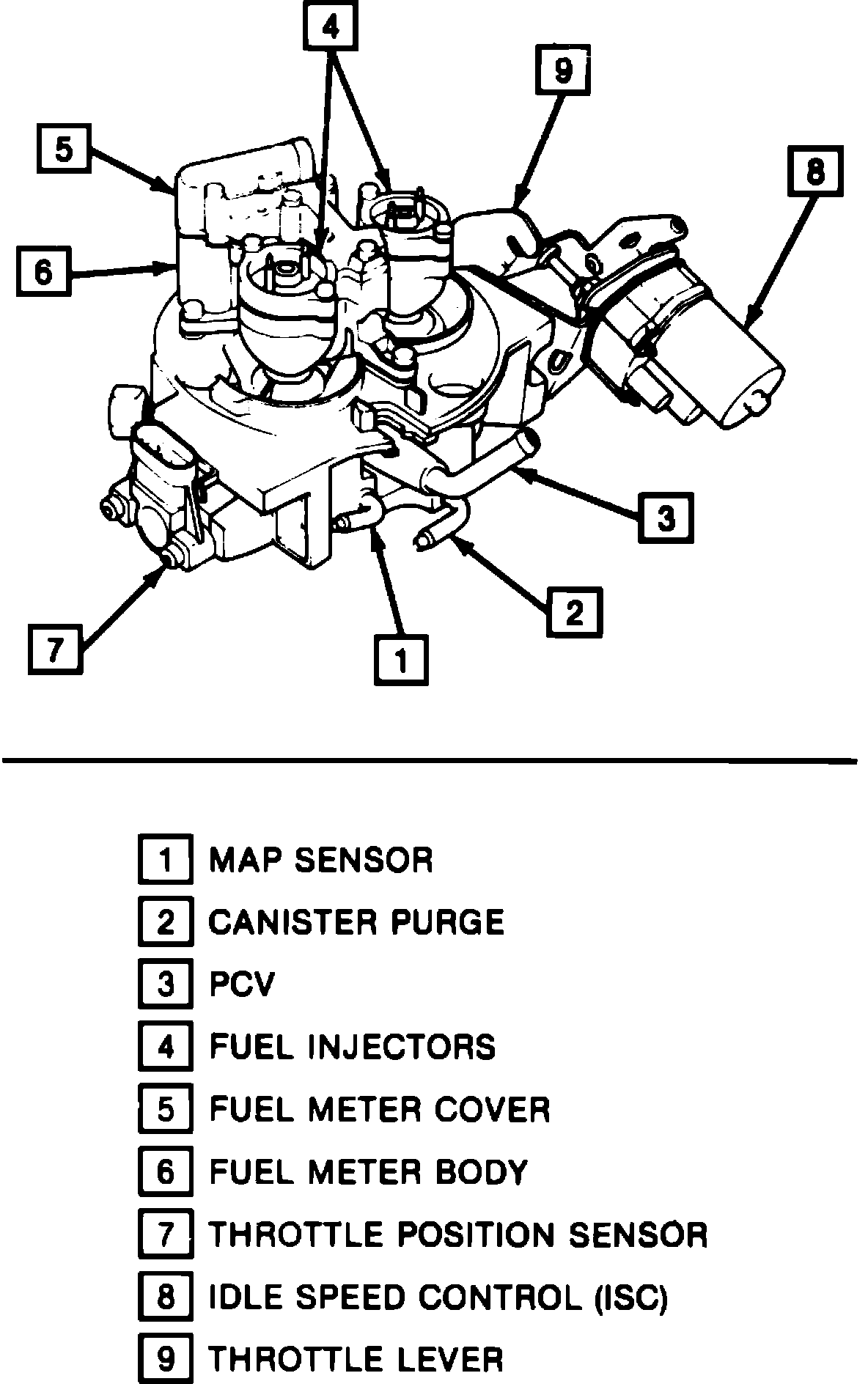 The throttle body contains an Idle Speed Control (ISC) control assembly and a Throttle Position Sensor (TPS). The throttle body portion of the injector unit may contain ports located at, above, or below the throttle valve. The ports are used to produce the vacuum signals for the canister purge system and the Manifold Absolute Pressure (MAP) sensor.
