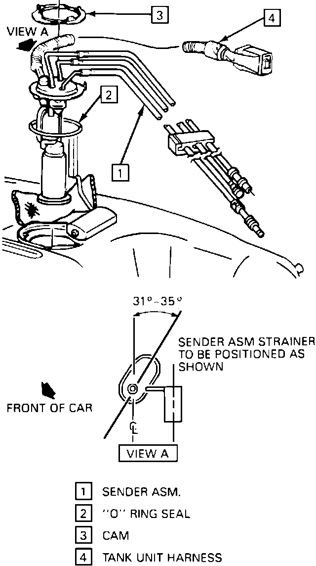 CAUTION: Care should be taken not to fold over or twist the fuel pump filter when installing the fuel level meter assembly as this will restrict fuel flow. Also, assure that the fuel pump filter does not block full travel of the float arm. Position the filter as shown in the illustration.