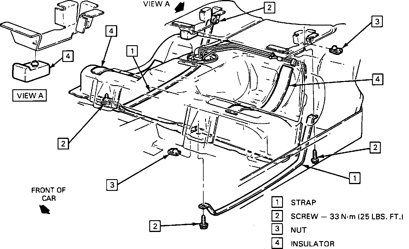 3. With the aid of an assistant, position and support the fuel tank. Install the fuel retaining straps, front attaching bolts and rear attaching bolts and nuts.