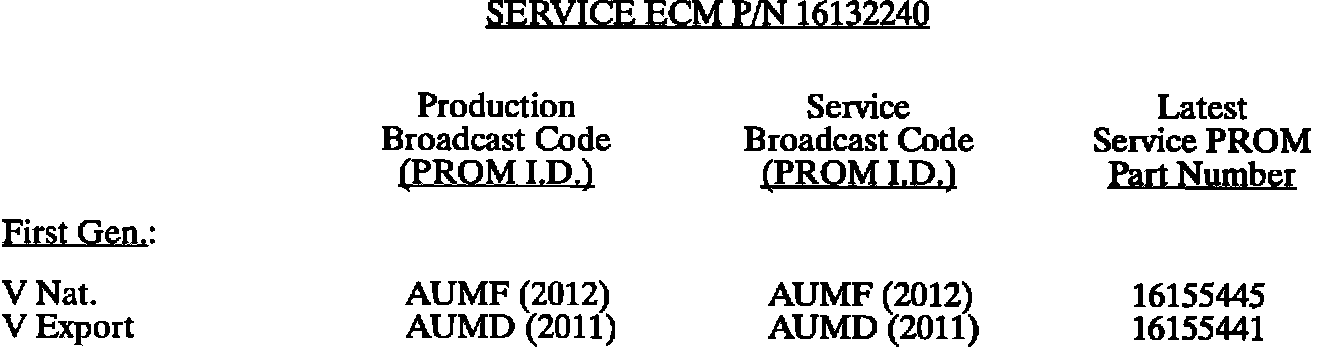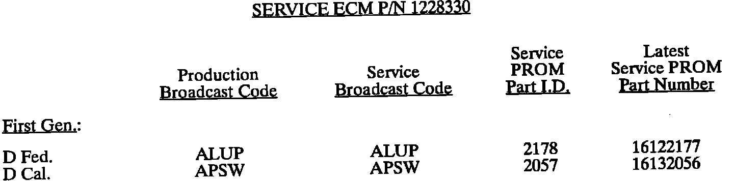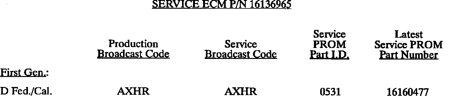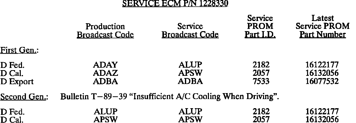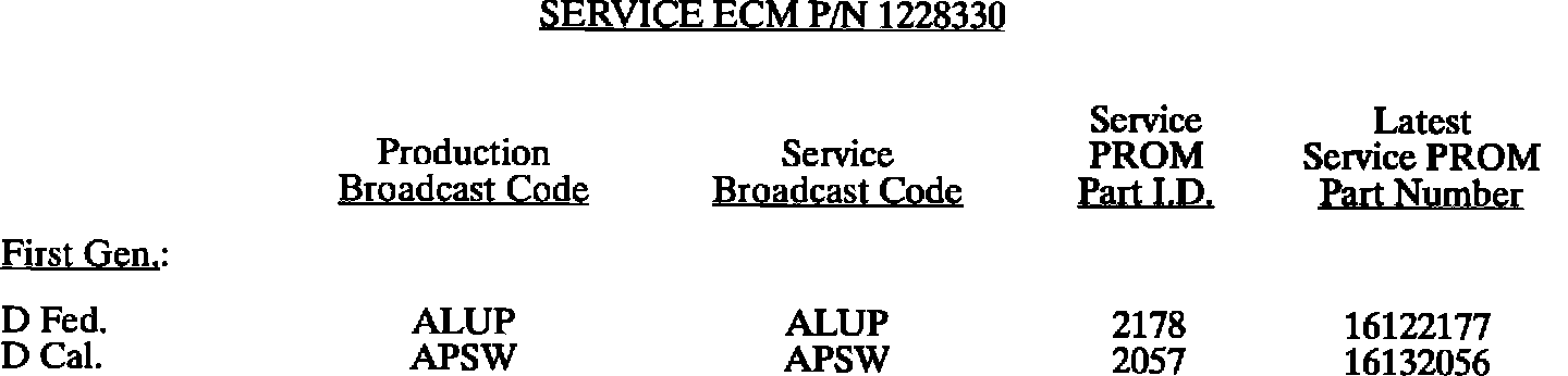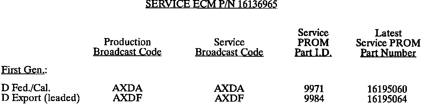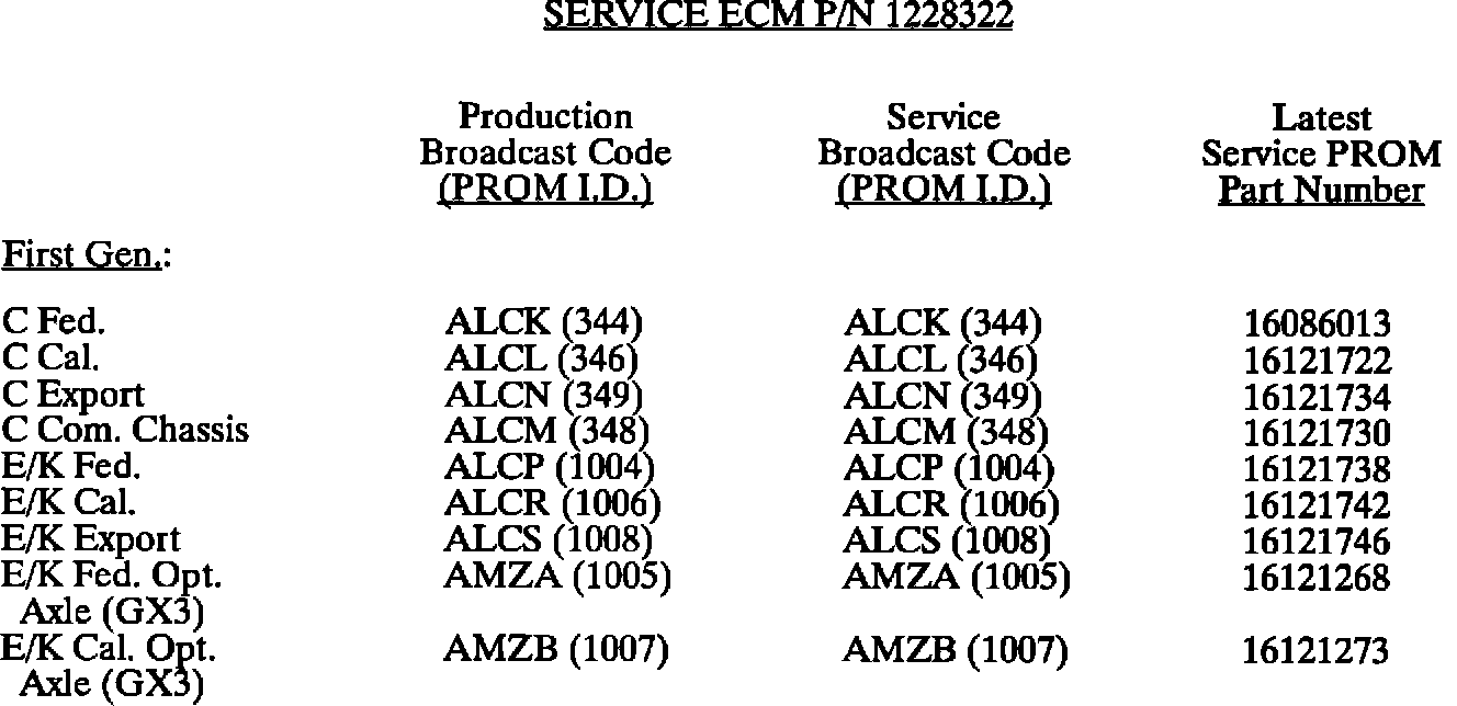 This bulletin summarize all 1980 through 1993 C, D, E, K, V, and J gasoline engine PROM calibrations to date. When any diagnosis leads to PROM replacement, the service PROM part number listed should be used. Should any additional PROM calibration changes be made, the GMSPO parts distribution system will automatically supersede these service part numbers.