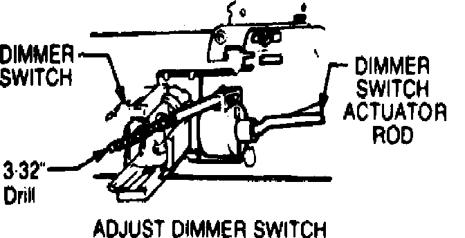 3. Install dimmer switch assembly, depress switch against actuator and insert 3/32 inch drill into adjustment slot, Fig. 4, then torque nut and retaining screw to 35 lb in