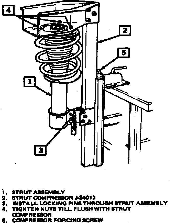 13. Remove three nuts securing strut assembly to strut compressor, the two locking pins at bottom of strut compressor and the strut assembly.