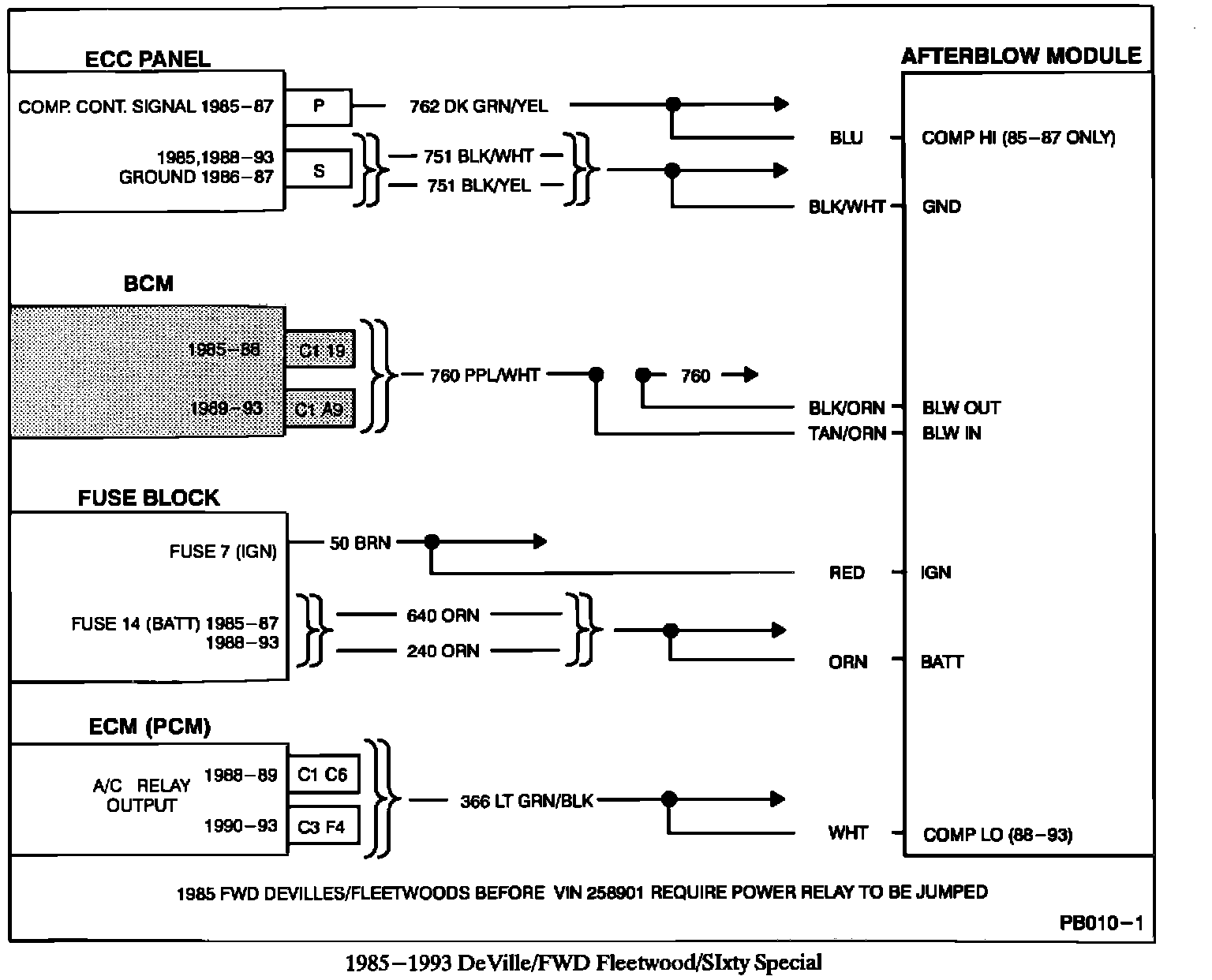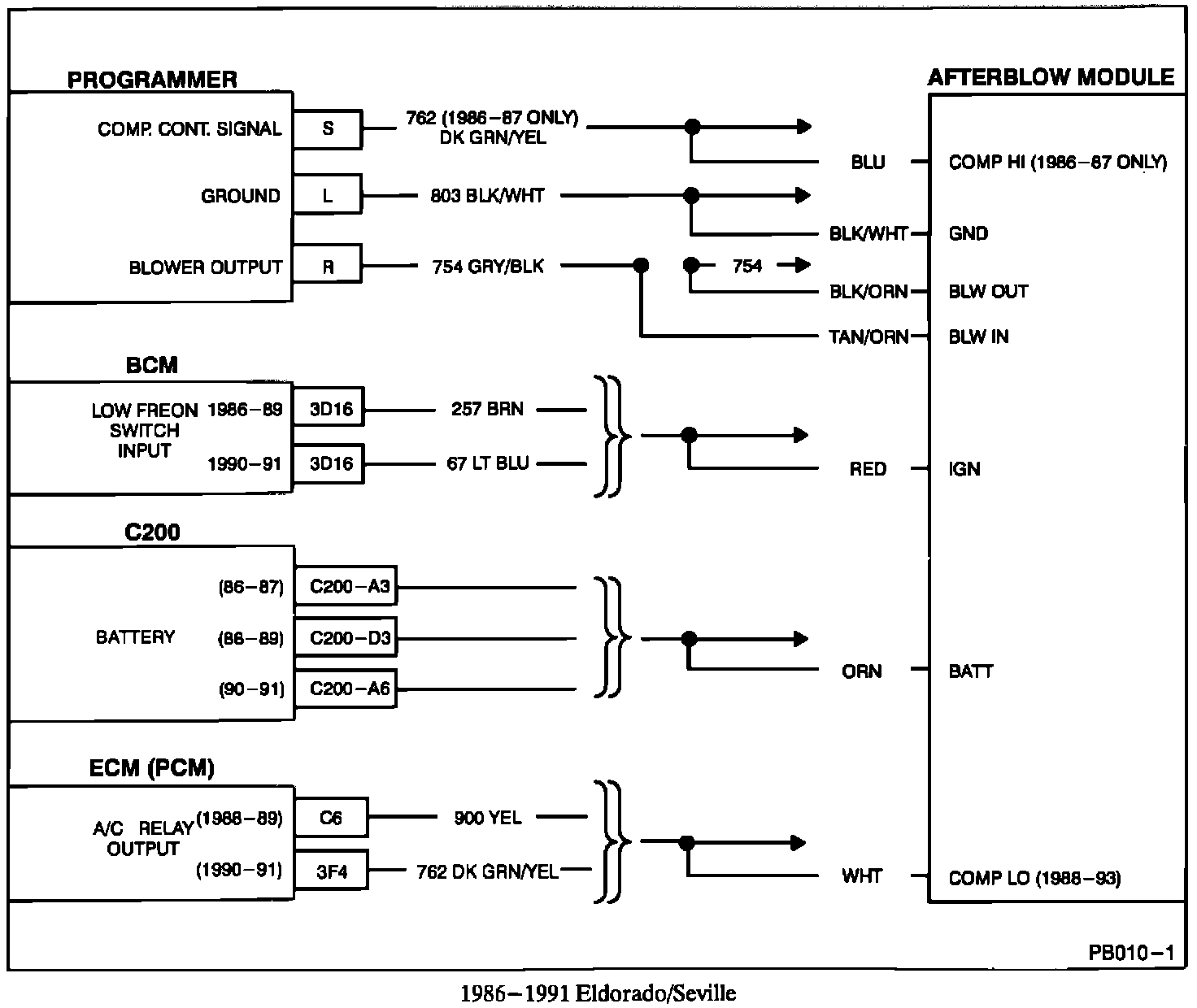 The installation of the afterblow module as outlined in the following steps will turn the blower motor on approximately 50 minutes after the vehicle ignition is turned off if the compressor was engaged for more than four minutes during the last ignition cycle. During the first 50 minutes after the vehicle ignition is turned off, the evaporator will accumulate water condensate on the core. Cycling the blower motor at high speed for approximately five minutes will force the water to be shed from the core and to drain from the evaporator case. This procedure is used to prevent the recurrence of the odor. Be sure to advise the owner of this change in operation.1. If vehicle is equipped with Passenger Side Air Bag (1993 Eldorado/Seville), refer to the appropriate Service Information Manual and follow the procedure to disable the SIR.
