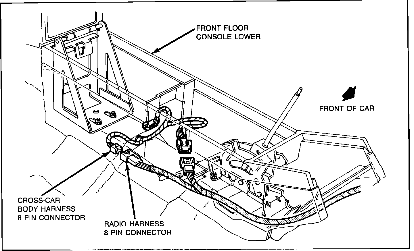 2. Access and disconnect cross-car to radio harness connection located within the center console. See Figure 1.