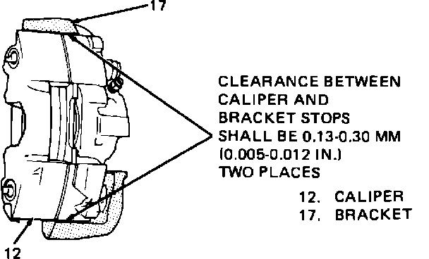 (Caliper-to-bracket stop clearance should be checked with calipers in position and the mounting bolts torqued to specification. Clearance measured at the two locations shown in Figure 2 should be within specifications for the vehicle tested. If clearance is too great, the caliper may move and cause a clunking noise when brakes are applied. If there is not enough clearance, the caliper may drag on the knuckle. Caliper bracket stops can be filed to adjust clearance.)